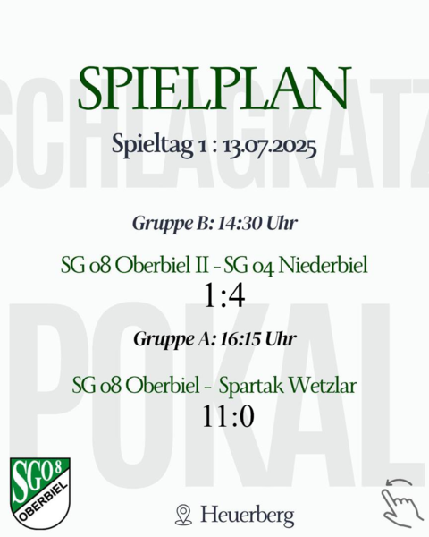 Traditionell vor dem Rundenstart lädt die SG 08 Oberbiel zum Schlagkatzpokal auf den Heuerberg ein. Am Sonntag gab es bereits die ersten sehenswerten Begegnungen und die Stimmung rund um den Platz war ausgezeichnet. Neben Bratwurst, Pommes und gekühlten Getränken gab es Tore am laufenden Band.