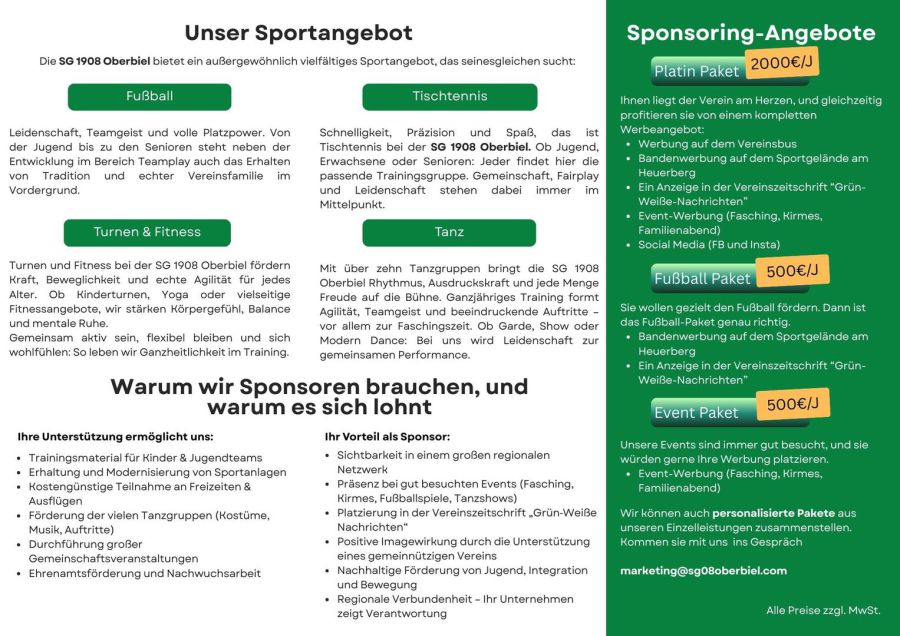 Wir würden uns freuen, mit dir ins Gespräch zu kommen, um dich zu beraten, wie du mit deinem Sponsoring der SG 1908 Oberbiel helfen kannst.
