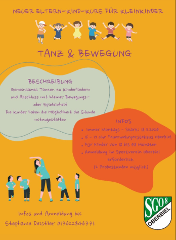 Daher gibt es jetzt seit November einen neuen Eltern-Kind-Kurs in Verbindung mit der Sportgemeinschaft in Oberbiel. Dort tanzen wir zu altbekannten und ganz neuen Kinderliedern. Ergänzt wird der