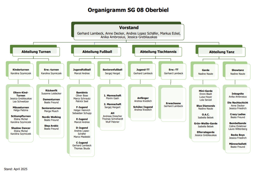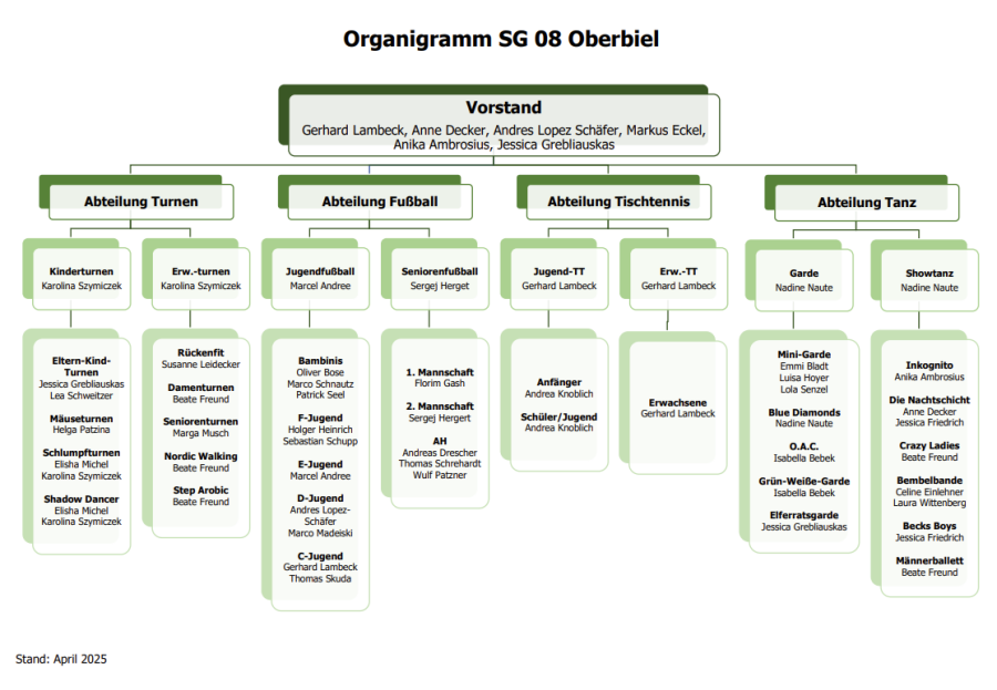 Hier finden sie das Orgsnigramm der SG 1908 Oberbiel. Kontaktdaten finden Sie in den jeweiligen Gruppen auf dieser Webseite. Bei Fragen wenden sie sich direkt an den Vorstand.